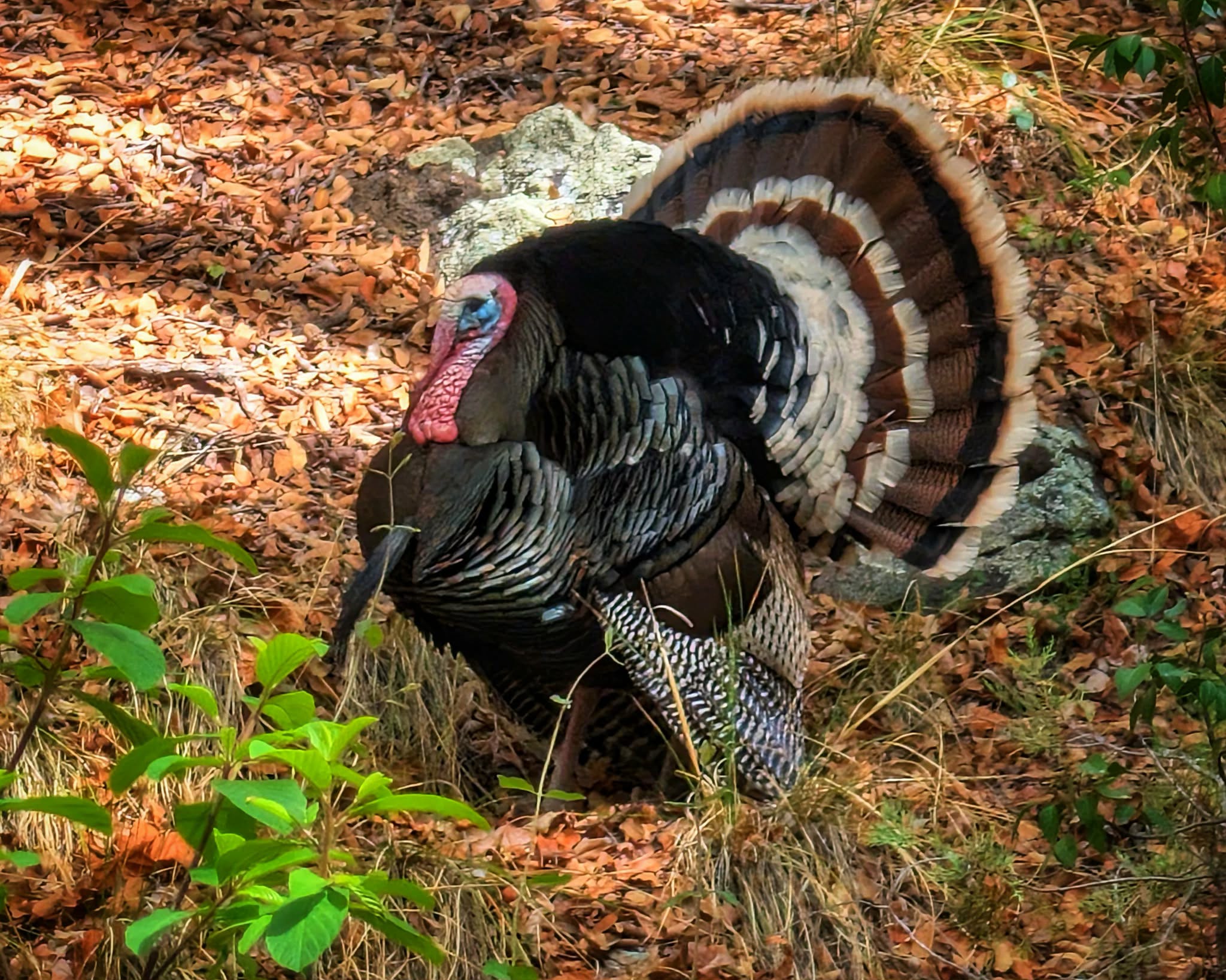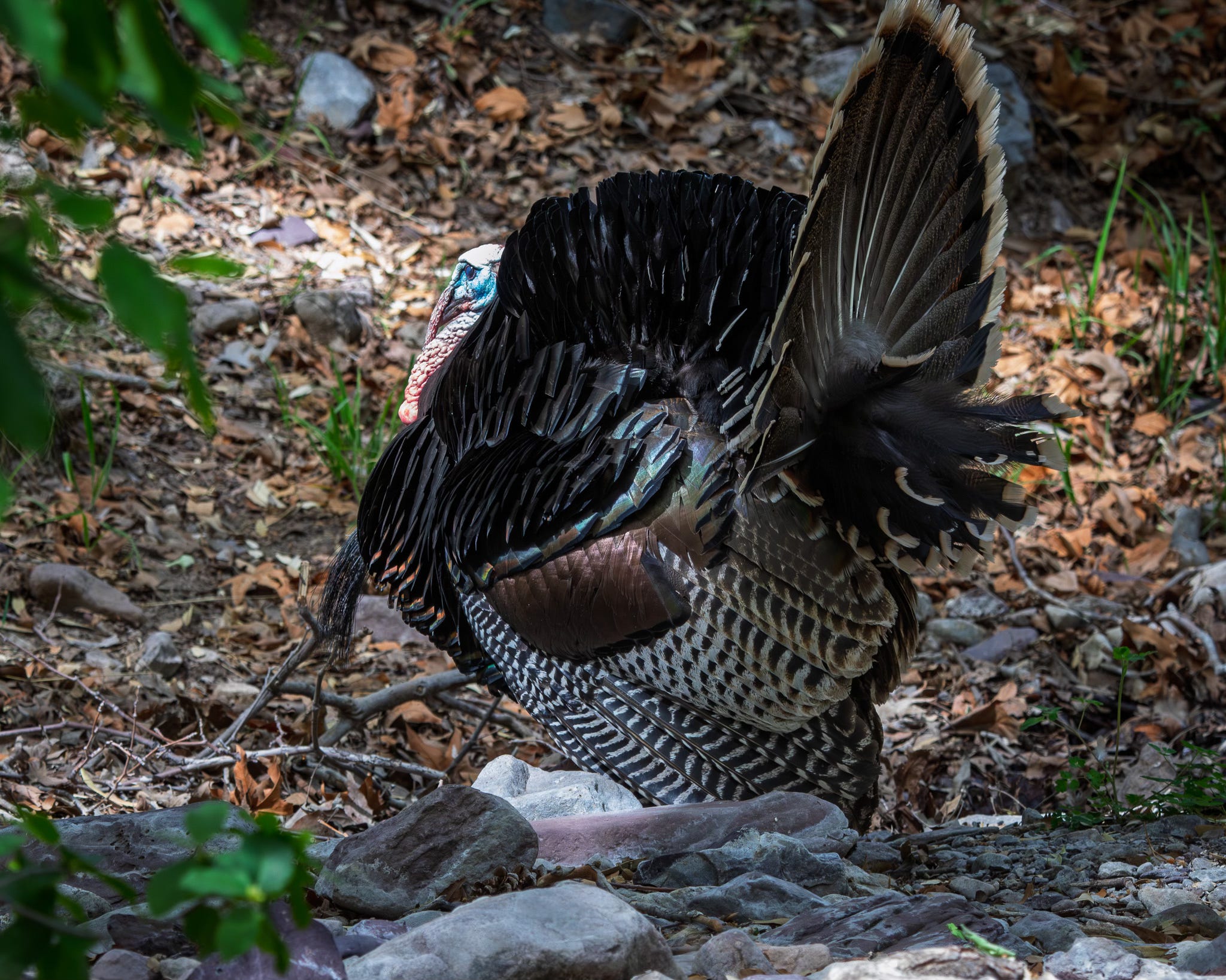 Almost as soon as we got out of the Jeep there was a male turkey strutting around and displaying his feathers for a couple of females.